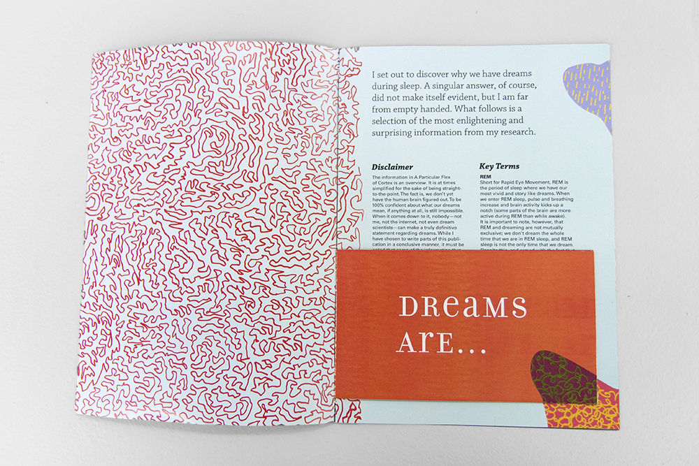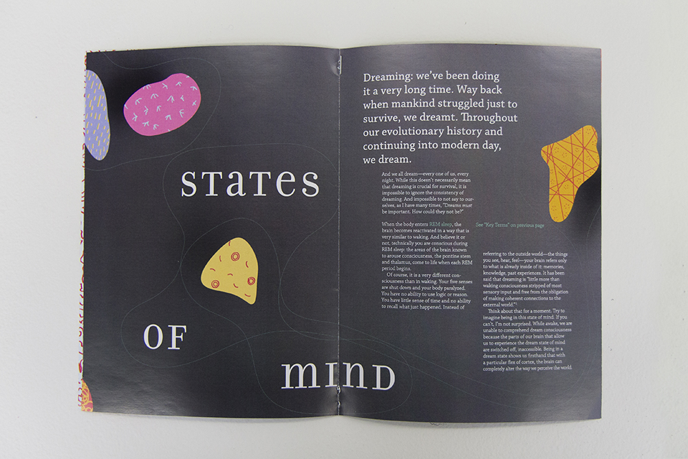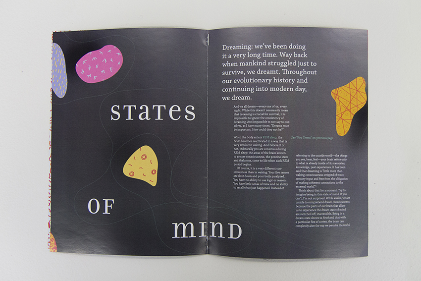 Senior thesis project. I began with an inquiry, “Why do we dream during sleep?” and researched this topic for seven months within the realms of neuroscience and psychology. Not finding a singular answer, I turned my energy toward fabricating a piece that would create an experience similar to that of dreaming. In addition, I designed a publication sharing the most interesting and surprising information from my research.
